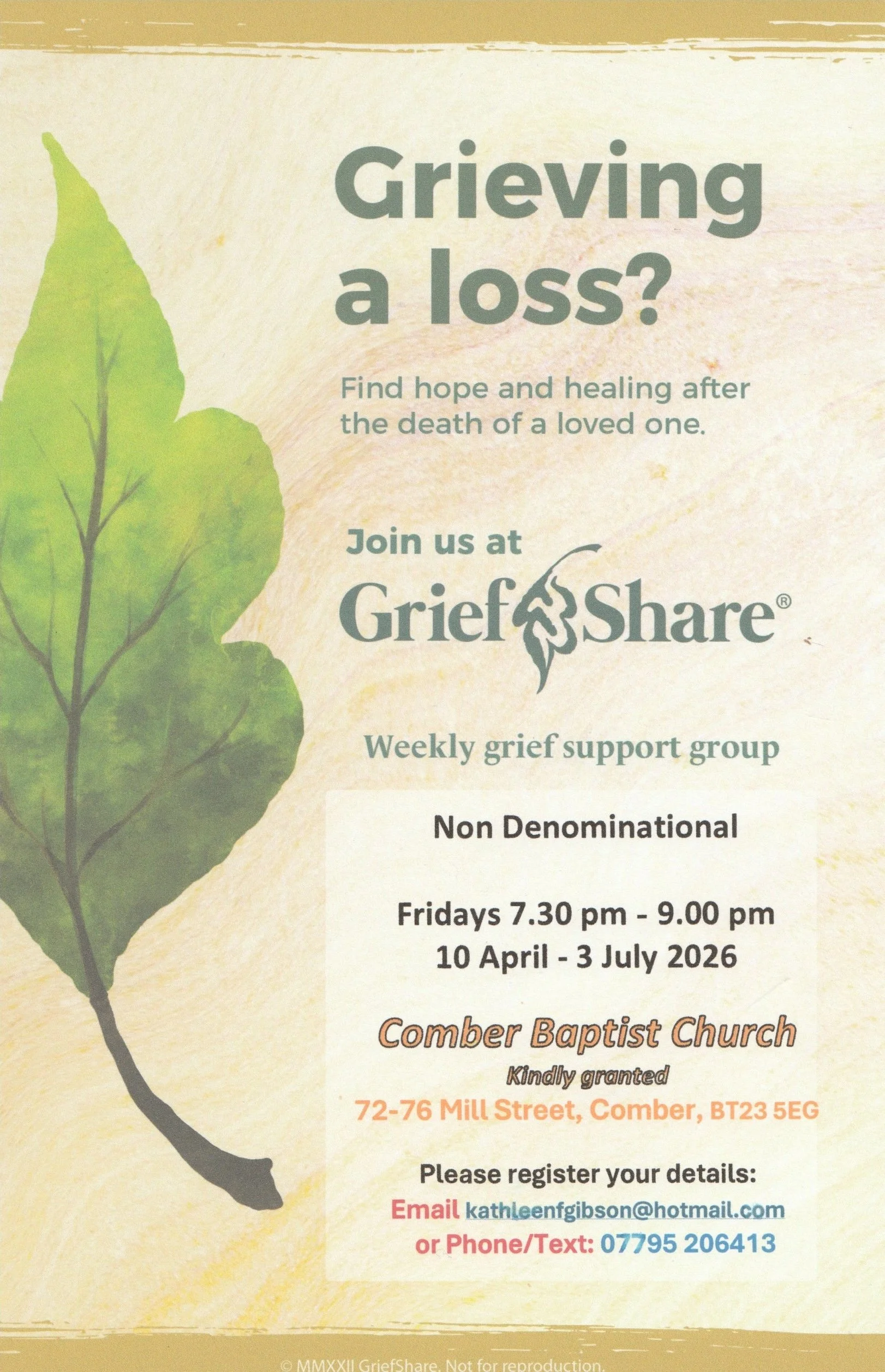 This Friday at 7:30pm we're running our GriefShare programme again. GriefShare is a grief recovery support group where you can find help and healing for the hurt of losing a loved one. Many have found this really helpful in the past. If you or anyone else wishes to attend please get in touch with us (contact details in the flyer below)